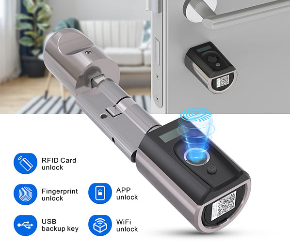 Open your digital door by fingerprint, with RFID card, with WELOCK app, with Wifibox and USB backup key.